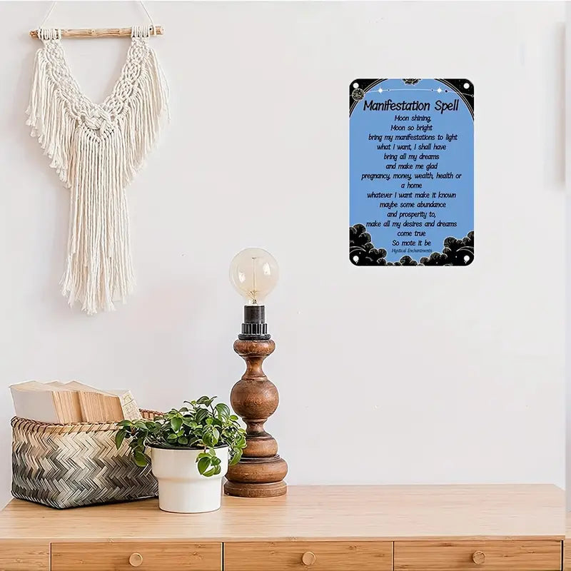 Vintage Celestial Manifestation Spell Tin Sign, 8x12" - Waterproof, Dustproof, Easy Install, Moon & Stars Metal Wall Art for Home, Office, Bar Decor
